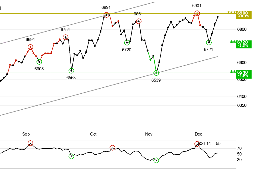The S&P 500 sits near 6,900, inside a rising channel and just under clear resistance around 6,900â6,950. It has closed at record highs as AI and mega-cap tech keep pulling the index up.