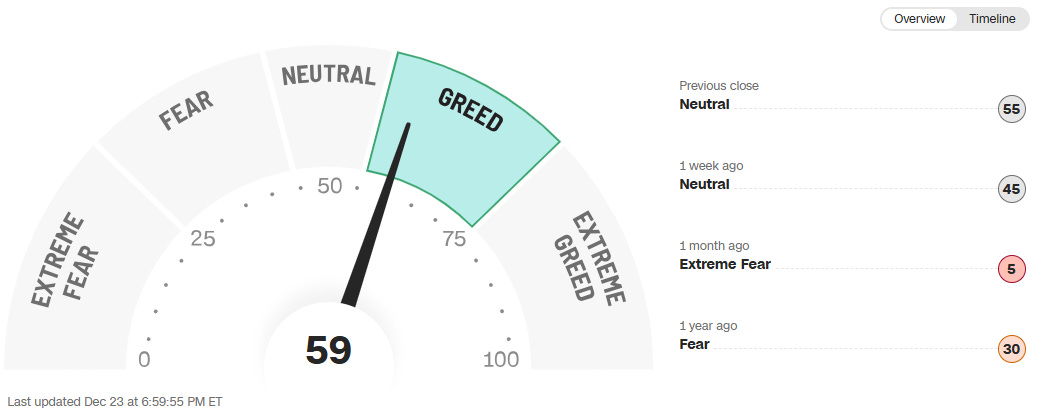 The Fear & Greed Index sits at 59 (Greed), up from 55 at the previous close, 45 one week ago, and a shocking 5 one month ago. One year ago, it was at 30. Thatâs a massive swing from extreme fear to greed in just 30 days.