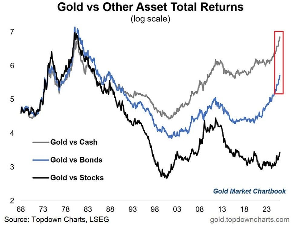 Pillar 3: Gold and silver surging to records isnât just about geopolitics. Itâs about investors losing faith in traditional assets. When gold outperforms Bitcoin (which barely moved this year), youâre seeing a flight to true safety.