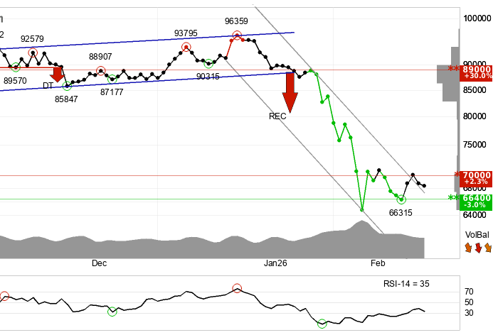 Resistance sits at $71,000. A break above that level would be a positive signal. A failure to break through $71,000 would confirm continued weakness.