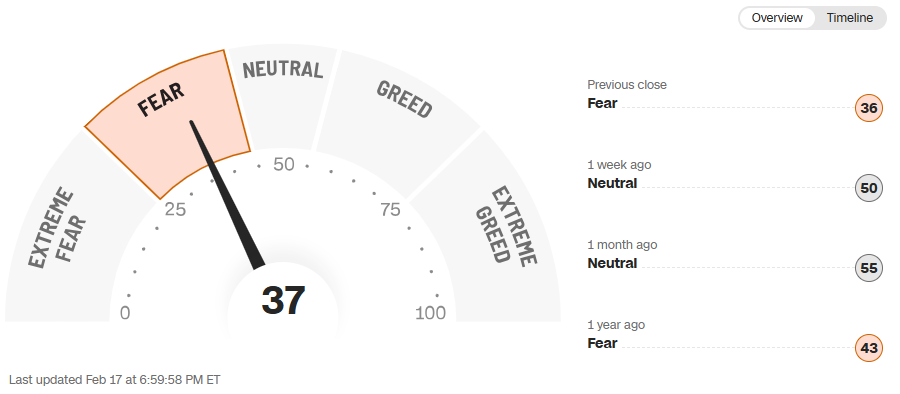 The Fear & Greed Index at 37, is firmly in Fear territory. A month ago it sat at 59 (Greed territory). One week ago it was at 43. A year ago it stood at 46. In less than four weeks, the marketâs emotional state moved from Greed to Fear. Thatâs a fast and meaningful shift.