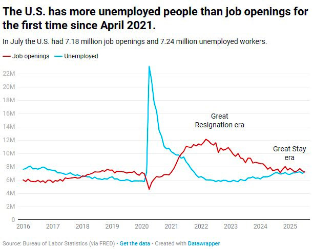 1️⃣ The US now has more unemployed people than job openings for the first time since April 2021. America is in a serious jobs slump.