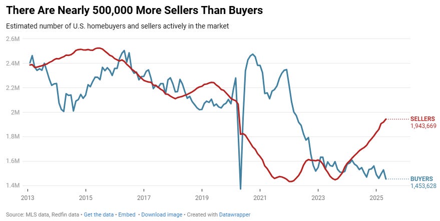 3️⃣ Housing data shows sellers now exceed buyers by over 500,000, marking the largest imbalance ever recorded in the market.