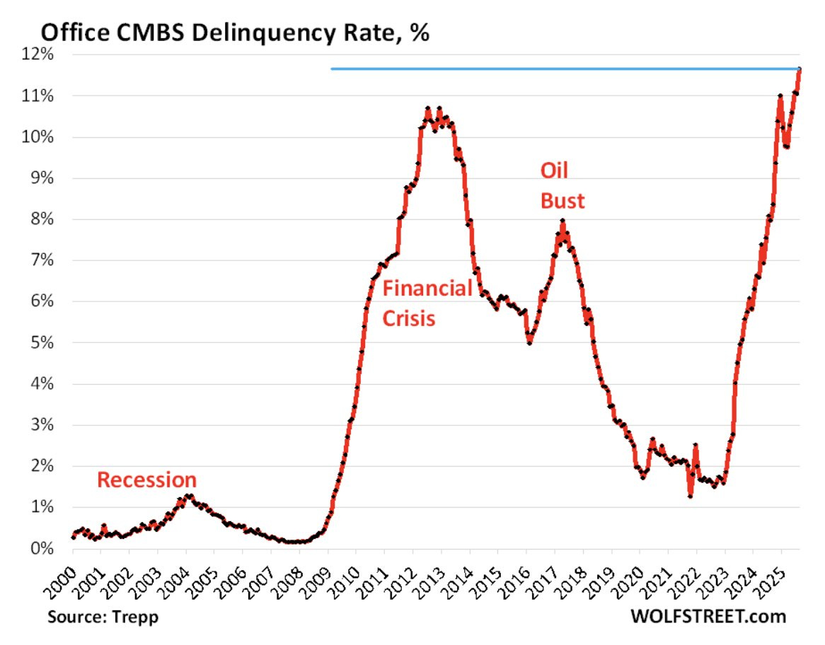 The office building market is experiencing something worse than the 2008 financial crisis. Commercial Mortgage-Backed Securities (CMBS) delinquencies just hit 11.7% - higher than the 10.7% peak during the banking meltdown.