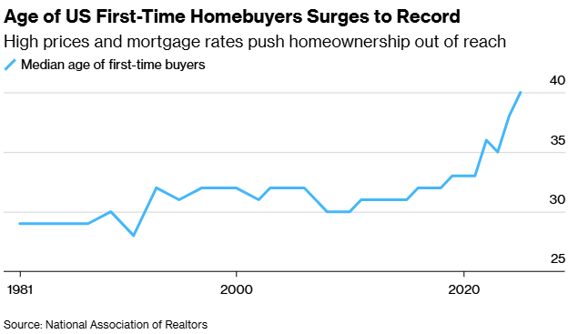 (1) The median age of a first-time homebuyer in the US is now at a record 40 years, up from 33 in 2021 and 29 in 1981.