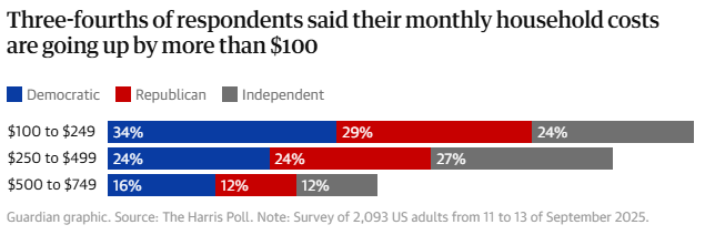 A Harris/Axios poll found that 47% of Americans say groceries are harder to afford than last year. A separate Guardian poll showed that 74% of Americans report their monthly household costs increased by at least $100. Some saw increases of $700+ per month.