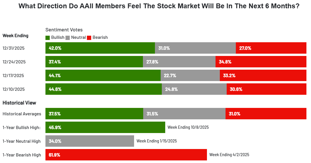 Bullish: 42.0% (up from 37.4% the prior week, above the historical average of 37.5%) Neutral: 31.0% (essentially at the 31.5% historical average) Bearish: 27.0% (below the 31.0% historical average)