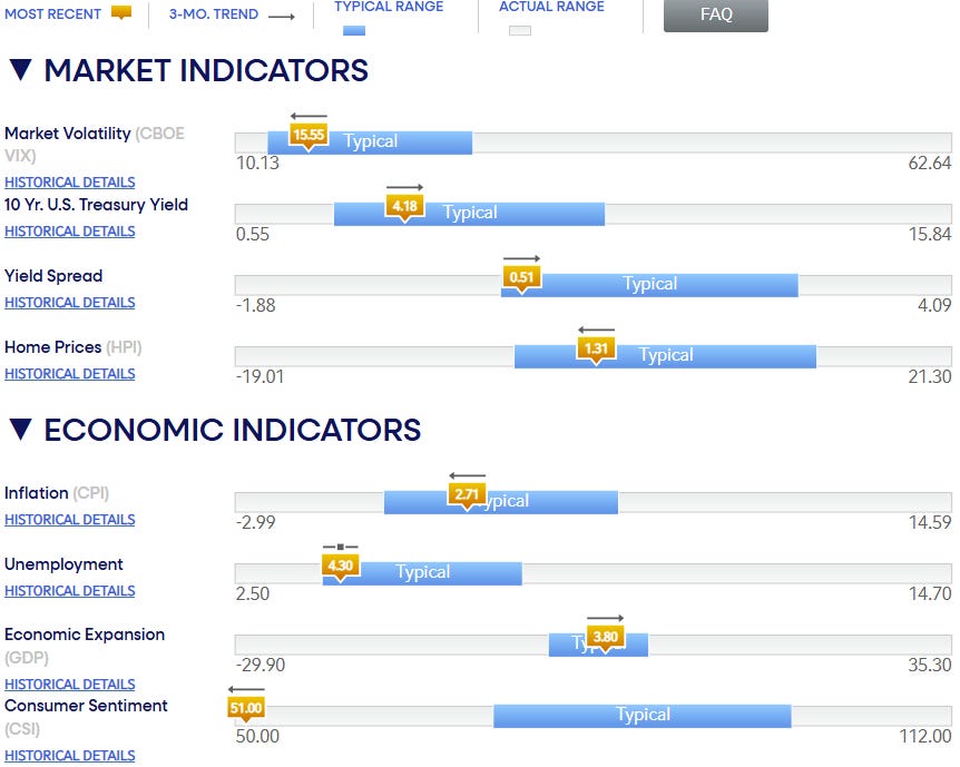 This is dangerously low—way below the “typical” range. This is the disconnect. We have 3.8% GDP growth (booming), but sentiment is at 51 (depressed). Why? Because even though inflation is slowing (2.71%), prices are still high compared to three years ago. We are all feeling the cumulative sticker shock at the grocery store.