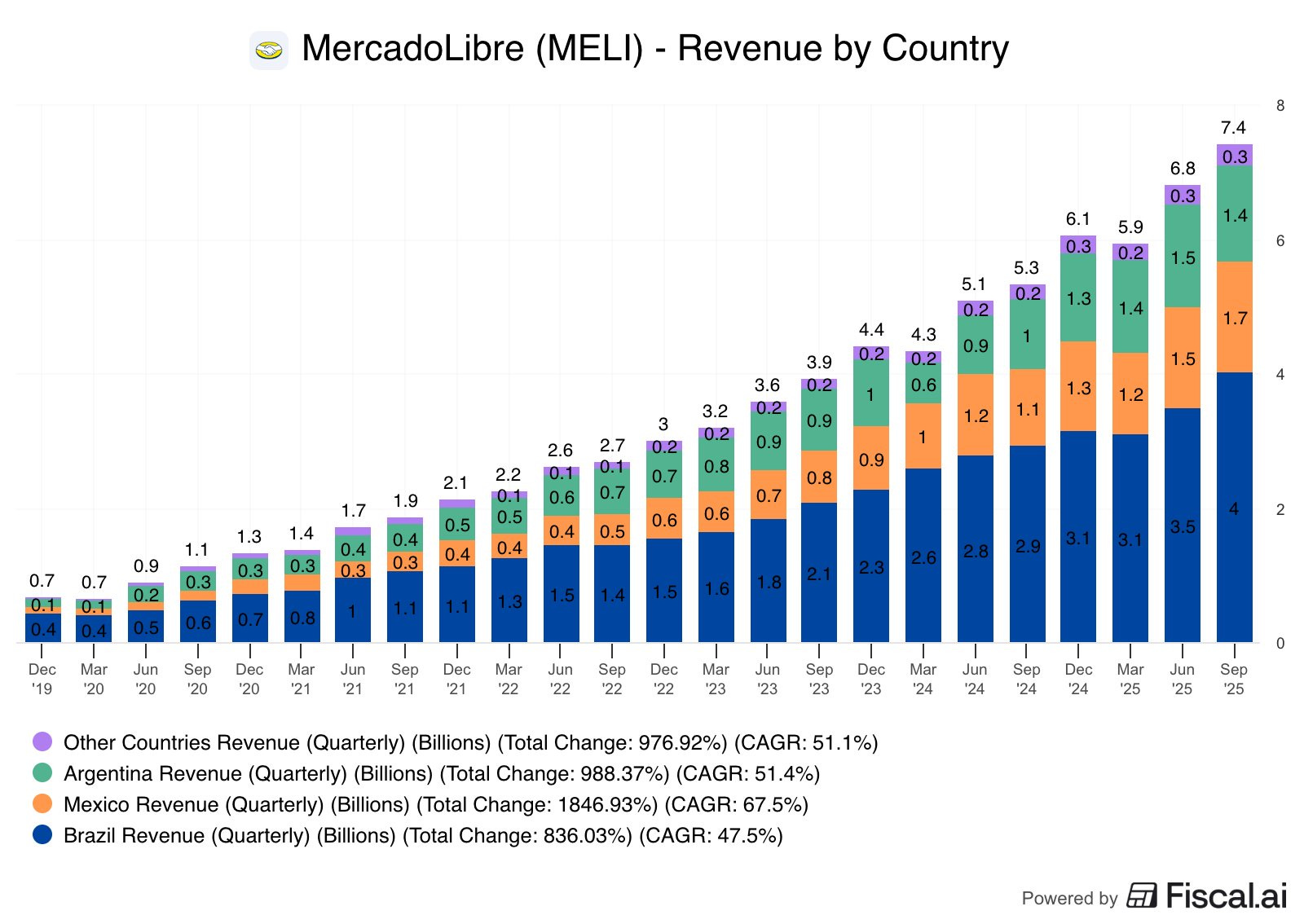 MercadoLibre dominates e-commerce across 19 Latin American countries. It served 76.8 million unique active buyers last quarter. Its digital payments platform, Mercado Pago, serves 72.2 million monthly active users. The company essentially built Amazon and PayPal in one, tailored for Latin America.