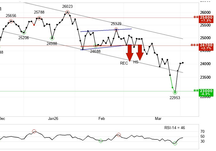 The Nasdaq broke down from a head and shoulders formation at around 24,736 — one of the most reliable bearish formations in technical analysis — triggering a sell signal. The downside target of 24,126 has been met, but the formation signals further downside potential. Support sits at 23,000. Resistance sits at 24,700.