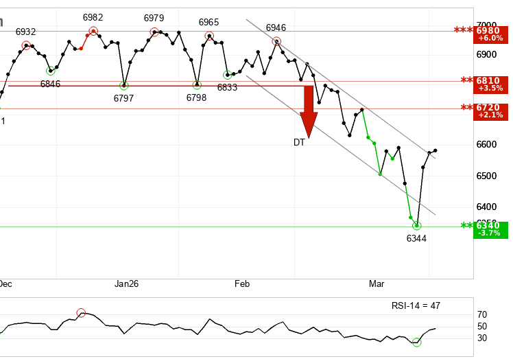 The index has broken upward through the ceiling of its short-term falling trend channel — which counterintuitively means the rate of decline is slowing, not that the index is surging. However, the recent double top formation at around 6,797 broke cleanly through support, and the downside target of 6,620 has now been met. The formation signals further potential downside before any meaningful recovery.