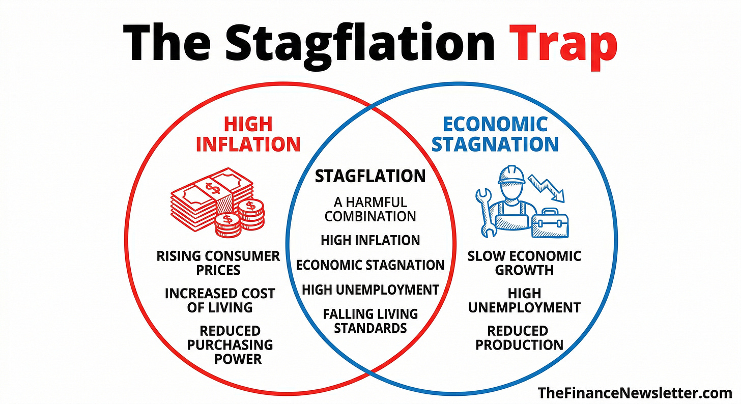 This is stagflation’s defining characteristic: a weak labor market that the Fed can’t rescue with rate cuts because inflation is running too hot. The two standard tools work against each other. That’s what makes this era genuinely difficult.