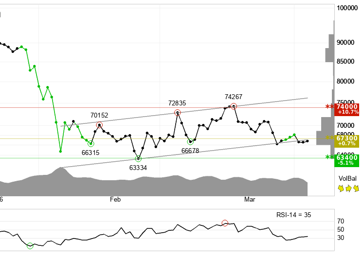 Bitcoin is at a critical technical decision point. It has broken through the floor of its short-term rising trend channel and marginally breached support at 67,300. An established break below that level would signal further downside. However, volume was high at prior price tops and low at prior price bottoms — a pattern that slightly weakens the bearish signal and suggests the breakdown may not be confirmed.