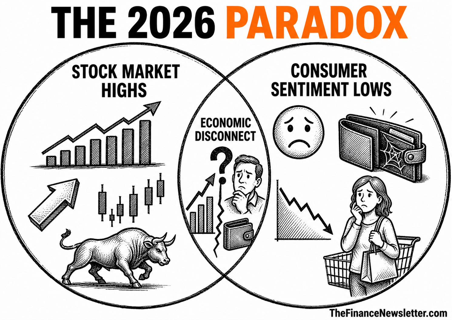 Five separate stories. One economic reality. The widening gap between what Wall Street is reporting and what Main Street is experiencing is the defining financial story of 2026.