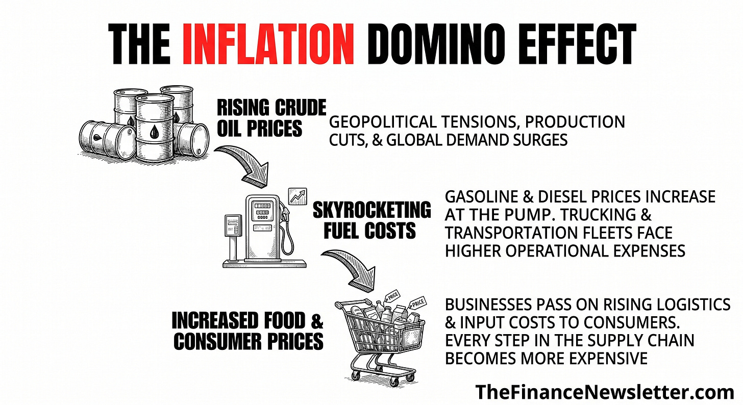 But here’s what most people miss: energy is an input cost for everything. Airlines pay more for jet fuel (Delta’s fuel bill jumps $2 billion this quarter). Construction crews burn diesel, which means PVC pipes cost 50% more and homebuilding stalls. Trucks carrying groceries burn more fuel, which creeps into every price on every shelf. The downstream effects on food, shipping, and agriculture haven’t fully hit yet. What we’ve seen is just the opening act.