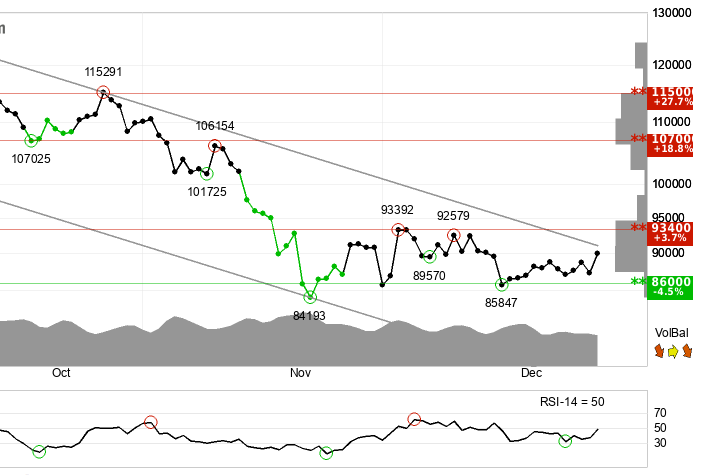 Trend: Negative Bitcoin is technically in a Negative trend for the short term. It is currently stuck in a âfalling trend channel,â meaning investors are accepting lower and lower prices to get out of their positions. The chart shows increasing pessimism. There is âsupportâ (a floor) at 86,000, but if it breaks that, it could tumble further.