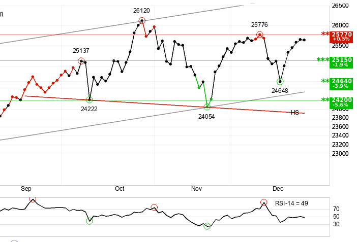 Verdict: Be careful here. If the index breaks below support at 23,916, it could drop further. This is a âwait and seeâ momentâdonât go âall inâ on tech until we see a clear breakout above 25,770.