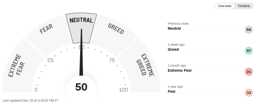 The current reading is neutral at 50, which sounds reassuring until you understand what it actually means. The Fear & Greed Index dropped from 57 a week ago and 55 at the previous close, showing a subtle shift away from greed.