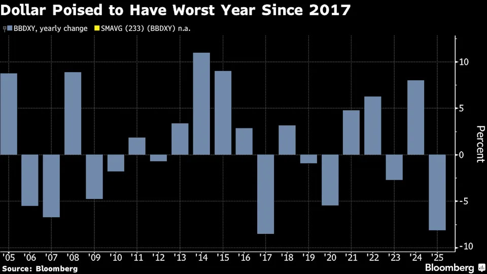 The dollar fell 9%, marking its worst year since 2017